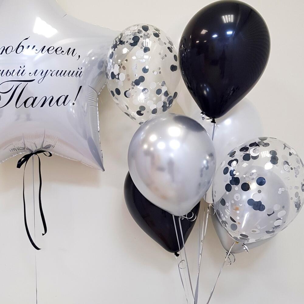 Создайте неповторимую атмосферу вашего торжества! Этот роскошный набор включает в себя большую белую звезду (76,5 см), дополненную вашей индивидуальной надписью (указывайте в комментариях!), и восемь премиум-шаров разных текстур и цветов: два серебристых хромированных, два черных латексных, два шарика с конфетти и два белых металлизированных (всего 30/35 см). Все шары выполнены из высококачественных материалов премиум-сегмента, обработаны специальным гелем для увеличения времени полета и доставляются в защитных транспортировочных пакетах. Два грузика обеспечат надежное крепление композиции.