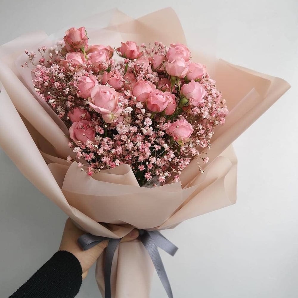 Великолепное сочетание классической красоты и легкой изящности. Розы, символизирующие любовь и страсть, дополняются пудровой гипсофилой, которые добавляют нежности и романтики в композицию. Этот букет станет прекрасным подарком для любого специального случая или просто для того, чтобы порадовать близкого человека.