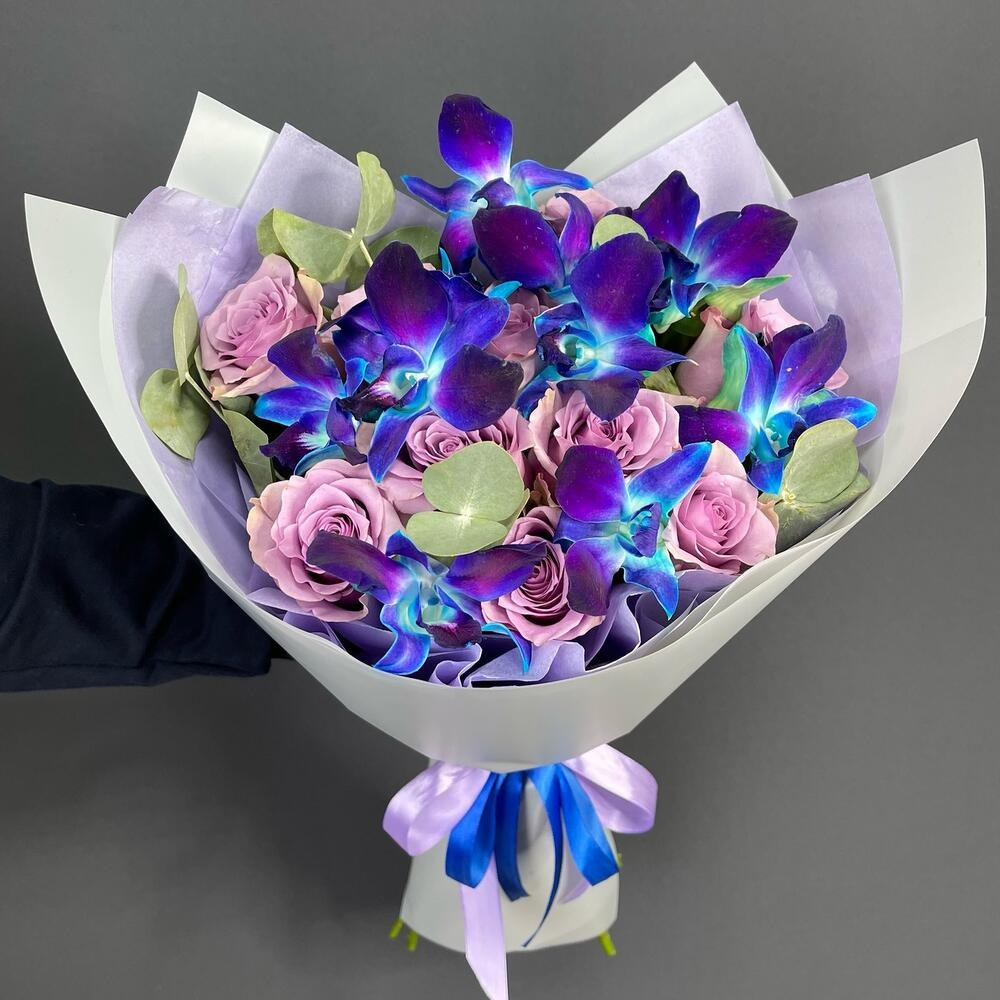 Яркий букет из сиреневой розы и дендробиума
