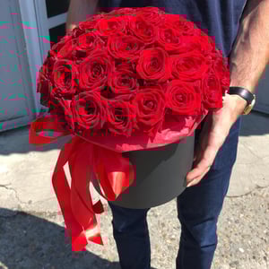 Шляпная коробка с цветами «Роскошная алая» из роз