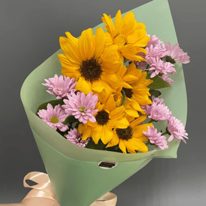 Букет подсолнухов и кустовых хризантем