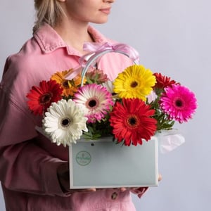Букет «Сумочка с герберами микс "Калейдоскоп"»