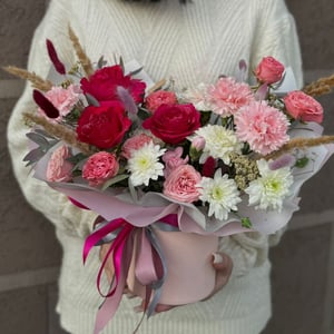 Сборный букет с гортензией и пионовидной из роз и гвоздик